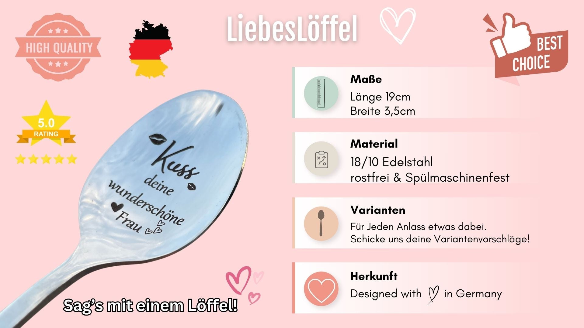 Zeige Deine Gefühlswelt auf einem Löffel. Ob zum Kaffee, zum Essen oder zum Kochen - der Löffel ist ein treuer Begleiter im Haushalt. Mit Liebeslöffel findest du das perfekte Geschenk und zauberst ein Lächeln auf das Gesicht deiner großen Liebe. Gib ihr das Gefühl, geliebt und geschätzt zu werden.