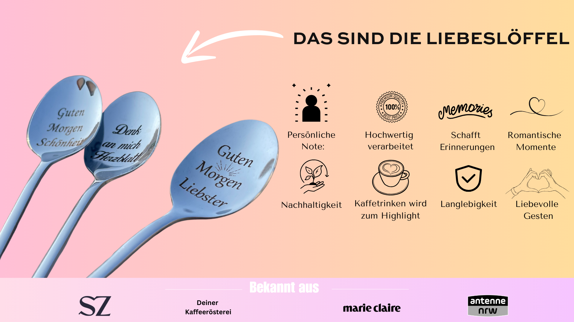 Zeige Deine Gefühlswelt auf einem Löffel. Ob zum Kaffee, zum Essen oder zum Kochen - der Löffel ist ein treuer Begleiter im Haushalt. Mit Liebeslöffel findest du das perfekte Geschenk und zauberst ein Lächeln auf das Gesicht deiner großen Liebe. Gib ihr das Gefühl, geliebt und geschätzt zu werden.